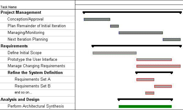The effort to define requirements is divided into smaller tasks with shorter durations (around 1 week is typical). These are represented in the example plan as "Requirements Set A", "Requirements Set B", and so on. Tasks are typically organized around use cases or scenarios, with other tasks to detail supplemental requirements or investigate specific issues or risks. |