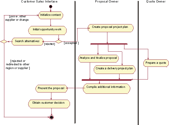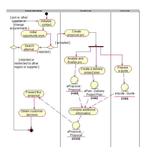As an example, we show an activity diagram of the realization of the business use case Proposal process, which you can find described Guidelines: Business Use Case.