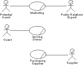 At a restaurant, the core business use cases are marketing and serving dinner, and the supporting business use case is purchasing supplies.