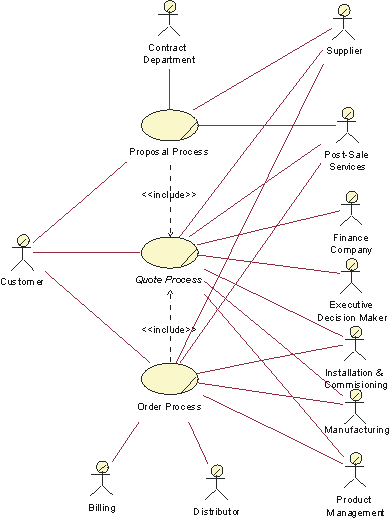 In this organization, a sale involves not just the agreement on a solution, but also to actually build the solution. To define a price for a solution, you need to engineer and build it to a certain level of detail. That is what is done in the Proposal Process. Once an agreement has been made with the customer, the solution is engineered in all details and then installed at the customer site. This is what is described in the Order Process. Both the Proposal Process and the Order Process include the abstract business use case Quote Process.