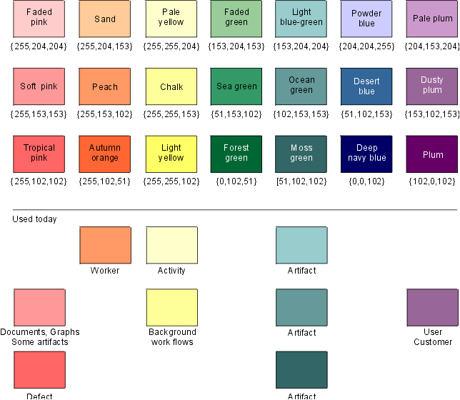 We use a subset of these colors to keep the online version harmonious from a color standpoint. In the picture below, you can see the colors in our subset, and how they're used. As you may notice, we aren't using all of them yet. The names of the colors are shown to help you choose the right ones in CorelDraw. The RGB value is also indicated.