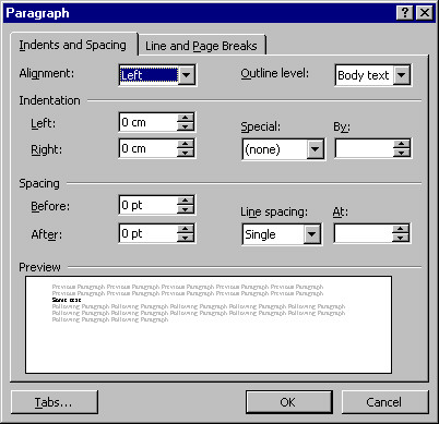 A secondary window in Microsoft® Word, which is a property window showing the properties of a paragraph.