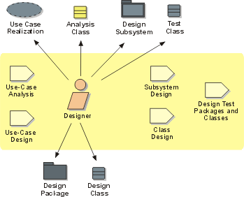 The designer role defines the responsibilities, operations, attributes, and
