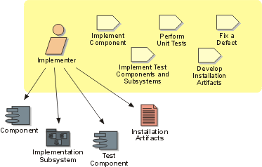 The implementer role is responsible for developing and testing components, in