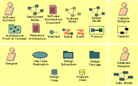 The roles involved and the artifacts produced in the Analysis & Design discipline.