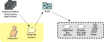The integrator integrates the system, in accordance with the integration build plan, by adding the delivered implementation subsystems into the system integration workspace and creating builds. Each build is then integration tested by a tester. After the last increment, the build can be completely system tested by a tester.