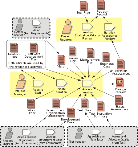 This workflow detail contains the activities that begin, end and review an iteration. The purpose is to acquire the necessary resources to perform the iteration (in Activity: Acquire Staff and Activity: Initiate Iteration), allocate the work to be done (in Activity: Initiate Iteration), and finally, to assess the results of the iteration in Activity: Assess Iteration. An iteration concludes with an Iteration Acceptance Review which determines, from the Iteration Assessment, whether the objectives of the iteration were met.