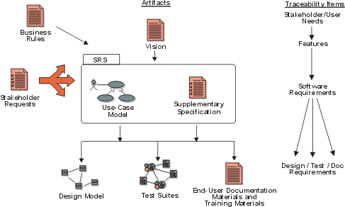 Traceability helps you understand and manage how input to the requirements, such as Business Rules and Stakeholder Requests, are translated into a set of key stakeholder/user needs and system features, as specified in the Vision document. The Use-Case model, in turn, outlines the how these features are translated to the functionality of the system. The details of how the system interacts with the outside world are captured in Use Cases, with other important requirements (such as non-functional requirements, design constraints, etc.) in the Supplementary Specifications. Traceability allows you to also follow how these detailed specifications are translated into a design, how it is tested, and how it is documented for the user. For a large system, Use Cases and Supplementary Specifications may be packaged together to define a Software Requirements Specification (SRS) for a particular "feature" or other subsystem grouping.