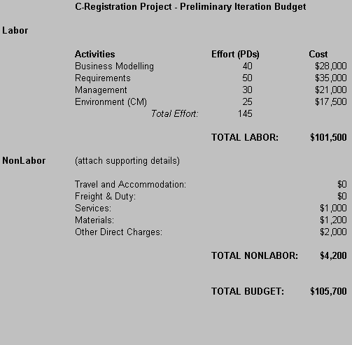 The following table shows the budget for the Preliminary Iteration. Wylie
